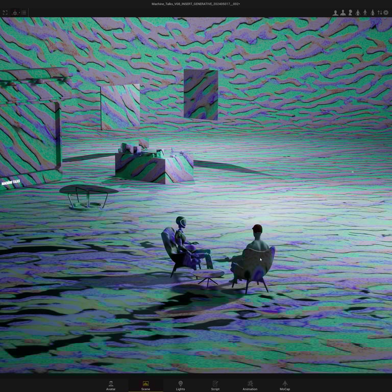Powered by Unreal Engine, AI-driven 3D characters take center stage to explore and deconstruct cutting-edge generative artworks. Virtual hosts interview contemporary human artists, investigating their creative processes and uncovering the inspiration behind their work.
